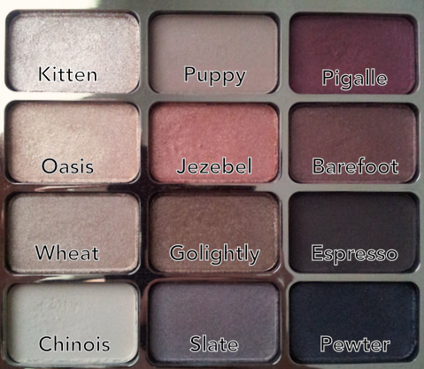 Chinois and Puppy are the two completely matte shades -- very powdery and chalky but they're okay to work with. Pigalle and Espresso have microglitter and look shimmery in the pan but when applied with a brush, it goes on like matte -- a little powdery but better to work with than the complete matte shades. The very shimmery shades are Kitten and Oasis, more glittery and metallic than the rest.